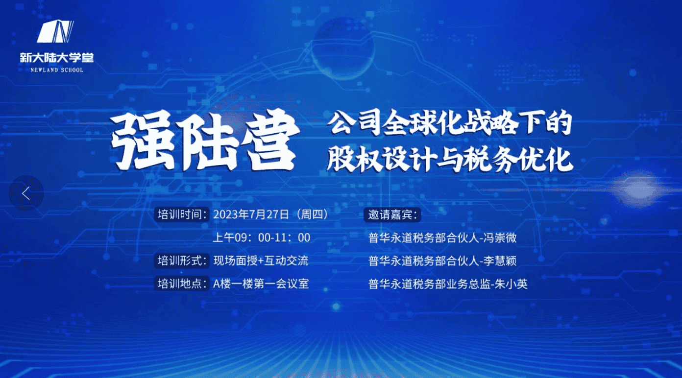 為增強(qiáng)公司相關(guān)人員對國際稅收整體籌劃的了解,推動(dòng)構(gòu)建公司全球化戰(zhàn)略的股權(quán)設(shè)計(jì)與稅務(wù)優(yōu)化的規(guī)范體系,為公司海外戰(zhàn)略布局提供有力支撐。7 月 27 日,在支付公司的推薦下,集團(tuán)人力資源部與股份公司財(cái)務(wù)部聯(lián)合特邀國際會(huì)計(jì)師事務(wù)所普華永道的合伙人李慧穎、朱小英,帶來新大陸強(qiáng)陸營 “公司全球化戰(zhàn)略下的股權(quán)設(shè)計(jì)與稅務(wù)優(yōu)化”分享培訓(xùn)會(huì),來自集團(tuán)總部職能平臺(tái)及各經(jīng)營單位67位有關(guān)海外業(yè)務(wù)、財(cái)務(wù)、投資的人員通過線上線下參加。