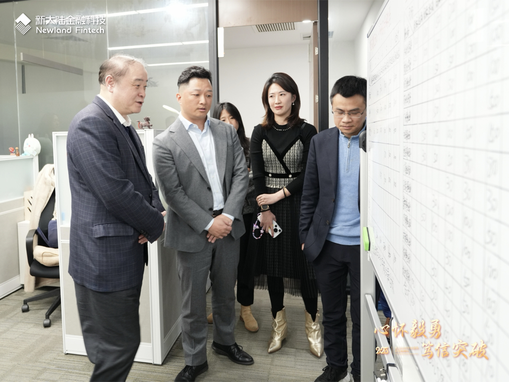 會議開始前,胡鋼董事長一行來到新大陸金融科技視察調(diào)研,與一線員工交流,了解業(yè)務(wù)開展情況,向員工們致以新春的問候,并針對產(chǎn)品、市場、風(fēng)控、研發(fā)等不同業(yè)務(wù)條線的員工提出新要求、新期待。胡鋼認(rèn)為,2025年將是AI應(yīng)用的元年,新大陸已在多個領(lǐng)域開展AI應(yīng)用的創(chuàng)新嘗試,金融科技同樣大有可為,希望全體員工積極擁抱AI、把握市場趨勢、強(qiáng)化團(tuán)隊協(xié)作,以更大的凝聚力打造更強(qiáng)的戰(zhàn)斗力。